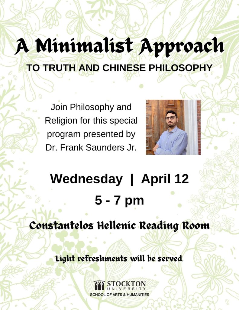 I’ll be giving a talk on April 12th at Stockton University titled “Truth and Chinese Philosophy,” which I am currently co-authoring with Jamin Asay (Purdue University). An abstract of the paper follows: